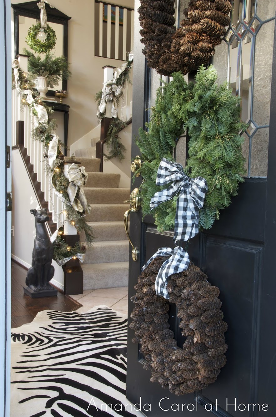 I purchased two pinecone wreaths from this lovely lady on Etsy and bought the fresh evergreen wreath from a local nursery. The black and white check ribbon is from three Christmases ago and the faux boxwood spheres are from HomeGoods last year.And here is a little peek into whats going on in the inside of the house: